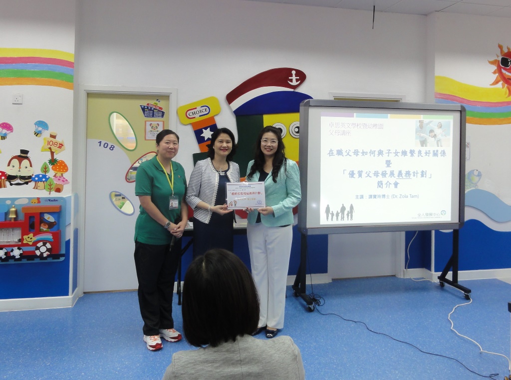 卓思英文學校暨幼兒園(青怡分校)家長分享會 10 月 17,2015 在〈卓思英文學校暨幼兒園(青怡分校)家長分享會〉中留言功能已關閉 卓思英文學校暨幼兒園(青怡分校)家長分享會 活動資訊 日期:2015 年 10 月 17 日(星期六)時間:上午 11 時至下午 12 時地點:卓思英文學校暨幼兒園(青怡分校)講題:優質家長發展義務計劃 – 第一次分享會對象:家長主講:義工團隊 – 譚寶玲博士及黃敬圖先生 活動簡介 是次活動是與卓思英文學校暨幼兒園(青怡分校)攜手推動家長教育,目的旨在推動和建立正確家長心理健康教育,策略性提升家長心理素質,協助建立健康家庭,打造下一代成為新世代精英。當日譚寶玲博士及黃敬圖先生親臨學校與家長們分享圖書的重點和育兒心得,並鼓勵家長在餘暇的時間閱讀圖書,讓家長能與子女維繫良好的親子關係,最後廖鳳香校長致送感謝狀給譚寶玲博士。 精華相片